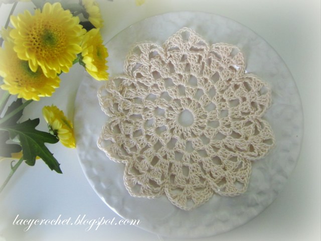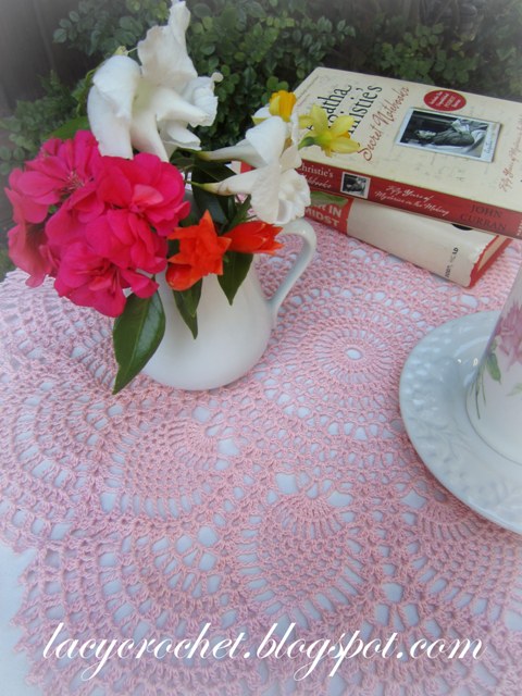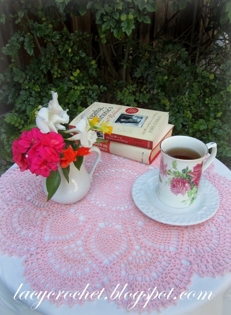 up in the garden for a cup of tea. My new doily is perfect as a table topper for