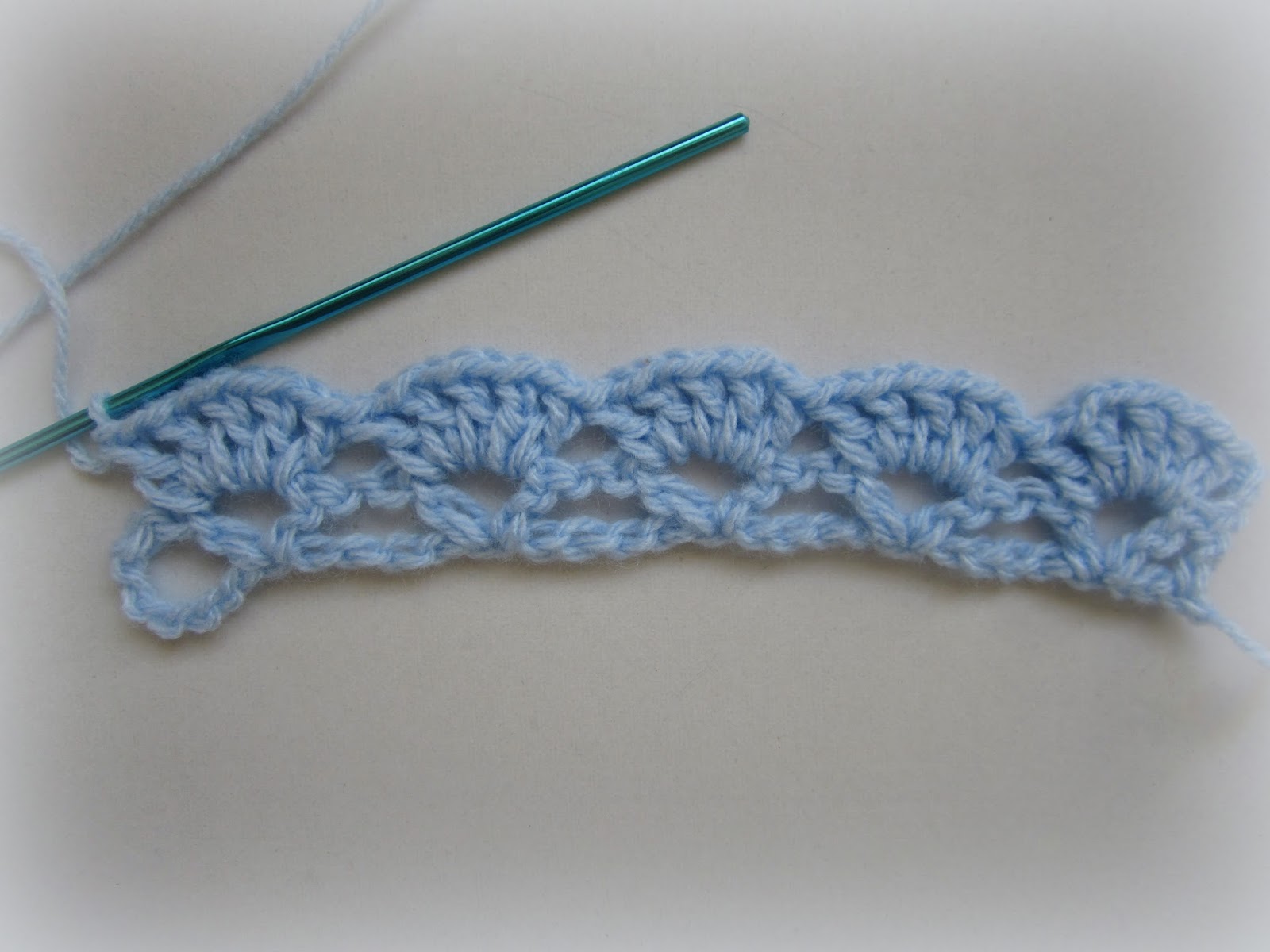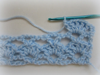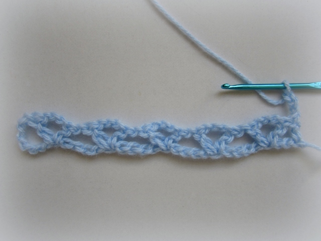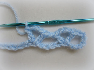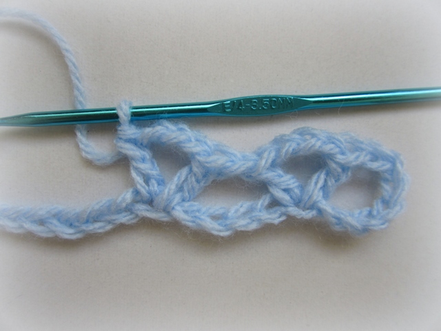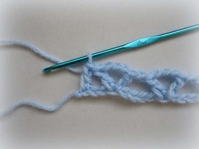 dc in 4th ch from hook, *ch 1, skip 2 ch, dc in next ch, ch 1, skip 2 ch, 2 dc in next ch* across.