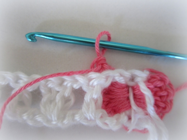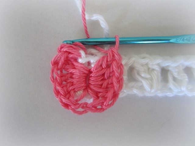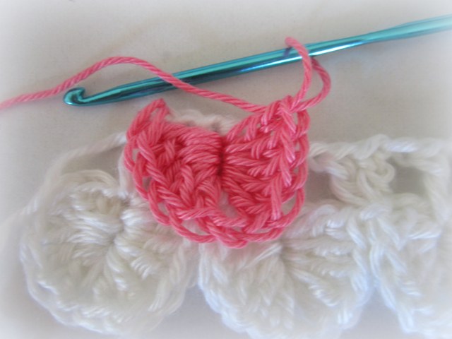 Row 2. In the next ch-3 space, make (dc, ch 1) four times, and additional dc. That’s how a shell is made.