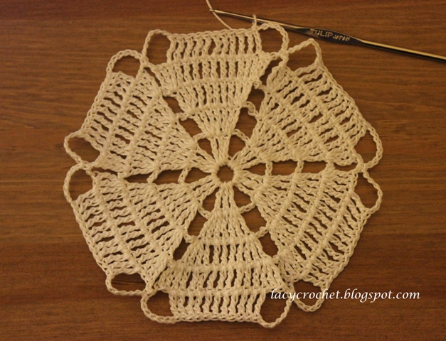 times, *skip next 2 tr, tr in next 3 tr, ch 7, skip next 2 tr, {sc in next ch-7