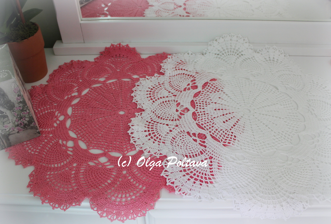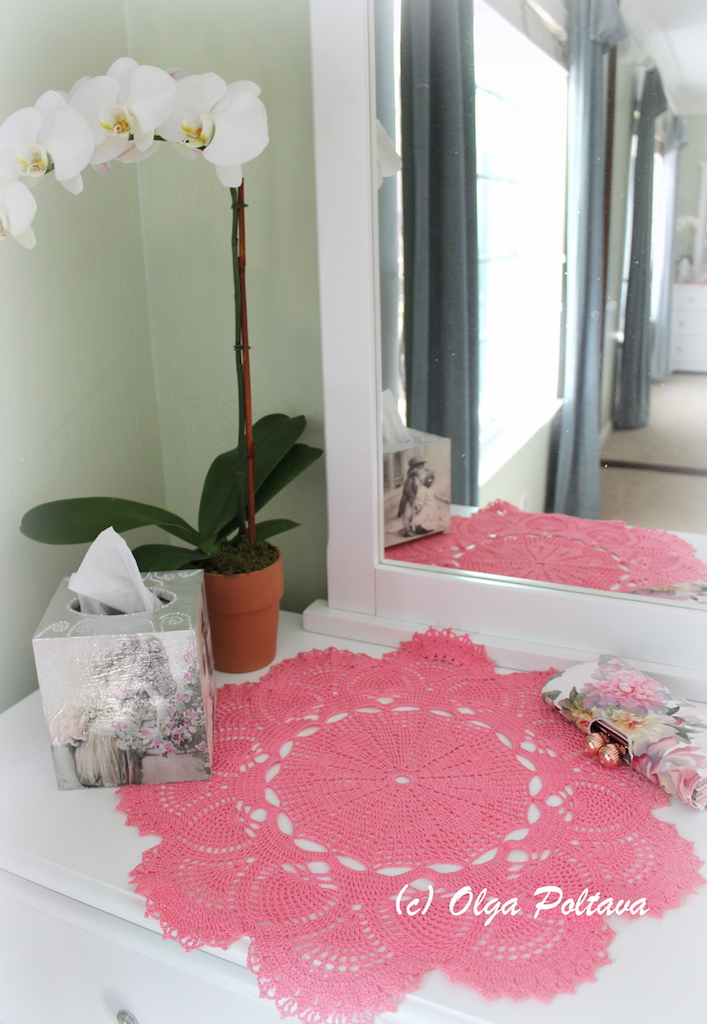 I used one skein of Grace by Patons yarn, which is 100% mercerized cotton, color Lavender, about 130 yards, and a size F/5 (3.75 mm) hook.